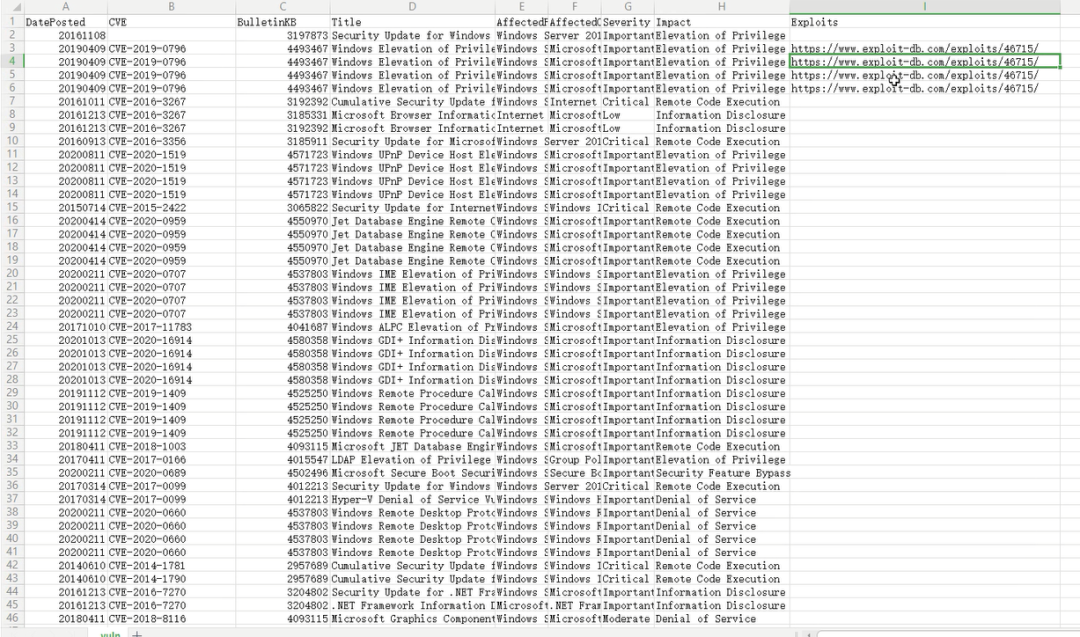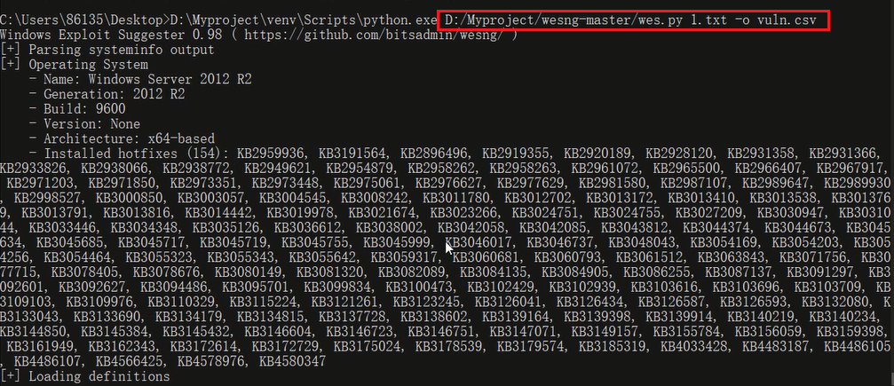 4.获取到补丁编号后,我们要进行补丁筛选,推荐两个优秀项目:wesng , windowsVulnScan。将上面收集到的信息保存到1.txt中,利用wesng进行补丁筛选