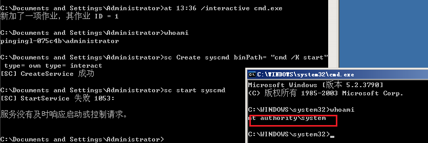 sc Create syscmd binPath= “cmd /K start” type= own type= interact #创建一个名叫syscmd的新的交互式的cmd服务