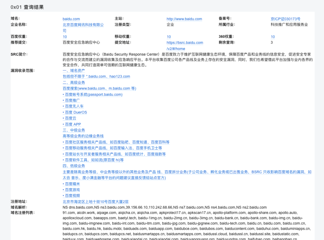 当前平台收录了国内 150 家左右的企业 SRC,包括漏洞盒子、补天上的专属 SRC,所收集的信息包括企业的名称、注册地址、漏洞提交地址、域名 dns 解析结果、企业所注册的所有域名等,以百度为例,如图: