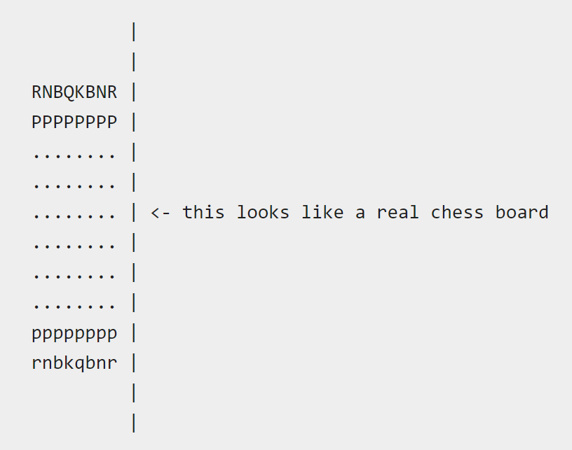 棋盘数组中的每个格子代表一个棋子、一个空白棋格或填充。我们可以使用数字常量来保存这些值,但为了方便调试,我们使用方便人类阅读的字符:大写字母和小写字母代表棋子,空格为填充,点代表空白棋格,如下所示: