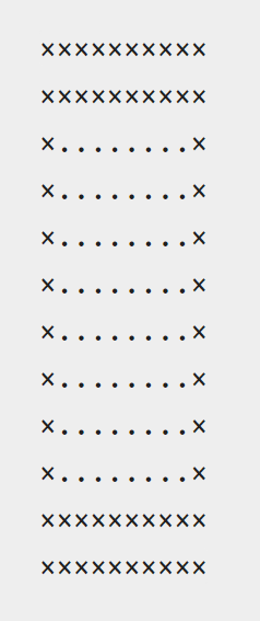 所以,我们需要在棋盘周围添加 2 个棋格大小的填充,即创建一块 12x12 的棋盘,用一个线性数组来表示。但其实,我们只需要一块 12x10 的棋盘,因为上一行最右边的填充也可以作为下一行最左边的填充,如下所示 (x 代表填充) :