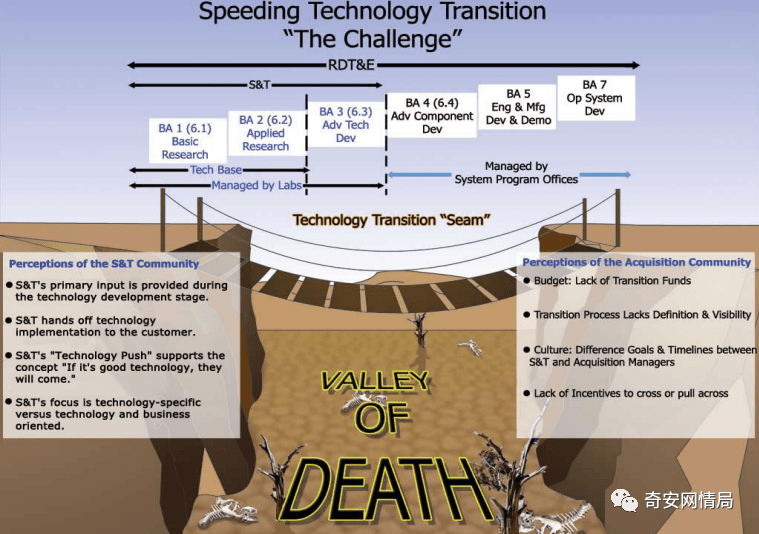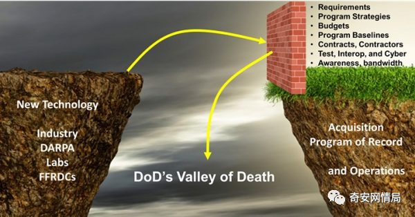 在研发界,“死亡之谷”是一个常用的比喻,用来描述将原型转变为可操作能力的最困难阶段。培养从研究到作战的敏捷式管道对于解决美国防部在开发软件系统时面临的挑战至关重要,例如快速发展的技术以及专家和非专家提供者的接受度和可用性。