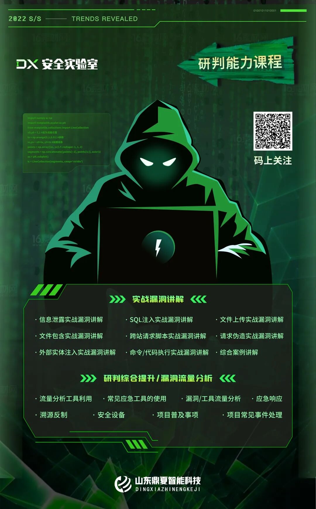 鼎夏智能结合多年安全行业教育教学经验,制定了研判能力提升培训课程,课程核心为“实战”。前10章节主要以渗透实战为主,可以学习到TOP10的特征和多重实战利用方式;后2章节主要以研判项目为主,可学习到综合研判工具使用,其中包括DX实验室自研工具以及研判能力知识点。