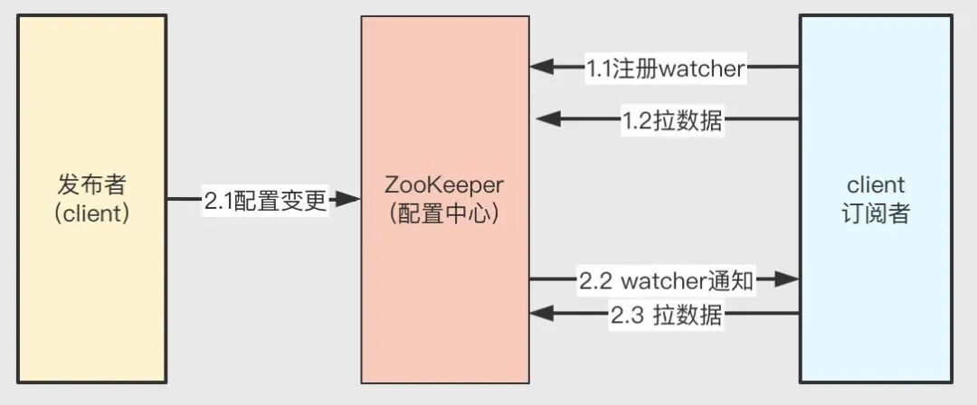 我们可基于 ZK 的 Watcher 监听机制实现数据的发布与订阅功能。ZK 的发布订阅模式采用的是推拉结合的方式实现的,实现原理如下: