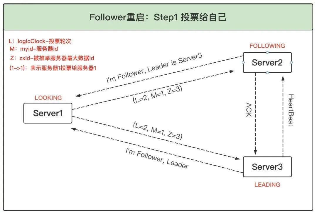 1、Follower 重启投票给自己:Follower 重启,或者发生网络分区后找不到 Leader,会进入 LOOKING 状态并发起新的一轮投票。