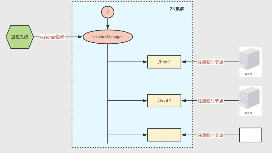 /dubbo 的根节点下;com.foo.BarService ;providers 和 consumers ,表示该服务的提供者和消费者;providers 下的表示该服务的所有提供者,而在 consumers 下的表示该服务的所有消费者。举例说明, com.foo.BarService 的服务提供者在启动时将自己的 URL 信息注册到 /dubbo/com.foo.BarService/providers 下;同样的,服务消费者将自己的信息注册到相应的 consumers 下,同时,服务消费者会订阅其所对应的 providers 节点,以便能够感知到服务提供方地址列表的变化。基于 ZK 的临时节点和 watcher 监听机制可实现集群管理。集群管理通常指监控集群中各个主机的运行时状态、存活状况等信息。如下图所示,主机向 ZK 注册临时节点,监控系统注册监听集群下的临时节点,从而获取集群中服务的状态等信息。