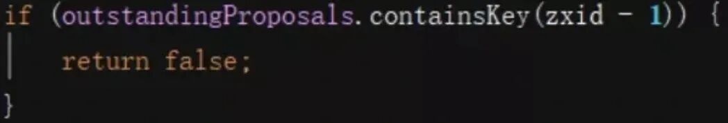 Leader 是如何判断当前 ZXID 之前是否还有未提交提案的呢?由于前提是保证顺序提交的,所以 Leader 只需判断 outstandingProposals 里,当前 ZXID 的前一个 ZXID 是否存在。代码如下: