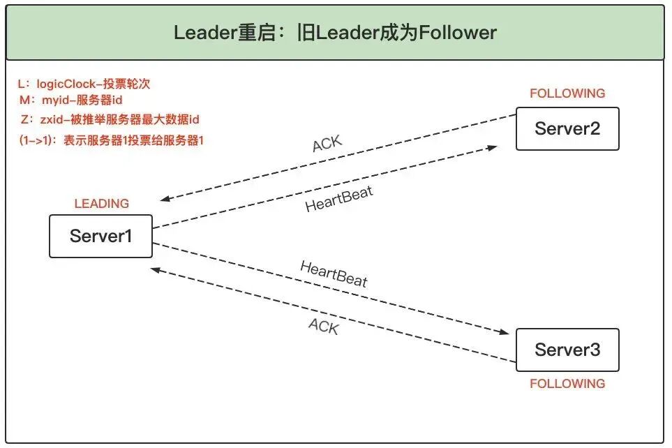 5、旧 Leader 成为 Follower:服务器 3 了解到 Leader 为服务器 1,且根据选票了解到服务器 1 确实得到过半服务器的选票,因此自己进入 FOLLOWING 状态。