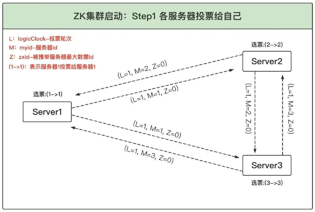 1、各自推选自己:ZooKeeper 集群刚启动时,所有服务器的 logicClock 都为 1,zxid 都为 0。各服务器初始化后,先把第一票投给自己并将它存入自己的票箱,同时广播给其他服务器。此时各自的票箱中只有自己投给自己的一票,如下图所示:
