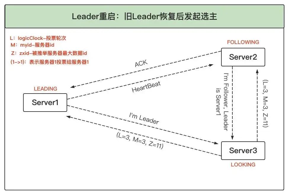 4、旧 Leader 恢复发起选举:之前宕机的旧 Leader 恢复正常后,进入 LOOKING 状态并发起新一轮领导选举,并将选票投给自己。此时服务器 1 会将自己的 LEADING 状态及选票返回给服务器 3,而服务器 2 将自己的 FOLLOWING 状态及选票返回给服务器 3。