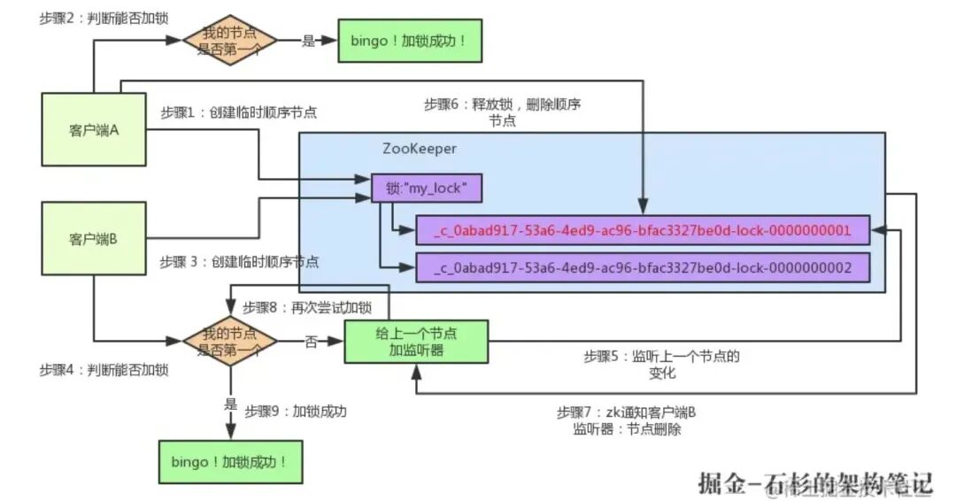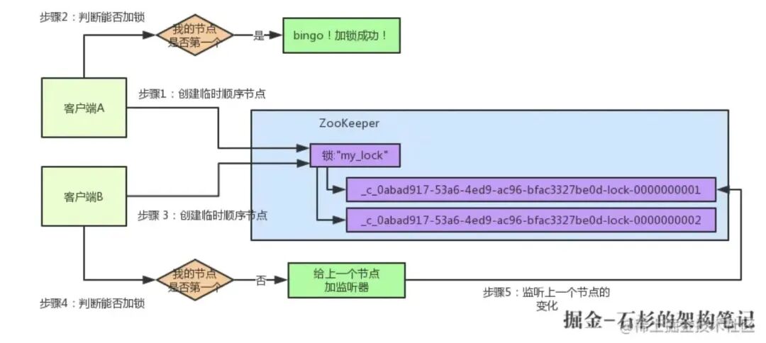 基于 ZK 的临时顺序节点和 Watcher 机制可实现公平分布式锁。下面具体看下多客户端获取及释放 zk 分布式锁的整个流程及背后的原理。下面过程引自七张图彻底讲清楚 ZooKeeper 分布式锁的实现原理【石杉的架构笔记】 。