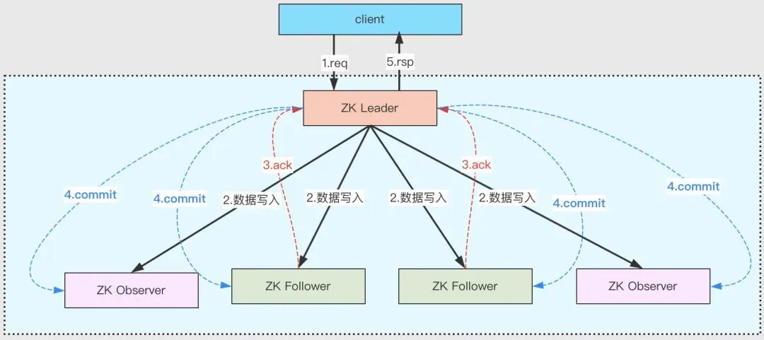 ZK 专门设计了 ZAB 协议(Zookeeper Atomic Broadcast)来保证主从节点数据的一致性。下面分别从 client 向 Leader 和 Follower 写数据场景展开陈述。