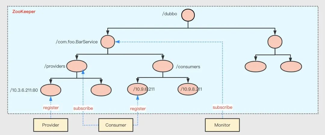 Dubbo 使用 Zookeeper 用于服务的注册发现和配置管理,详情见上文“命名服务”。