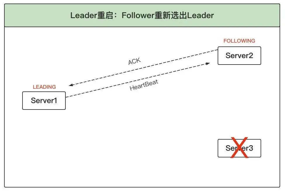 3、重新选出 Leader:此时由于只剩两台服务器,服务器 1 投票给自己,服务器 2 投票给 1,所以 1 当选为新 Leader。