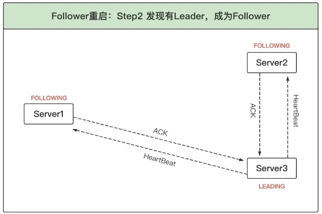 2、发现已有 Leader 后成为 Follower:Server3 收到 Server1 的投票后,将自己的状态 LEADING 以及选票返回给 Server1。Server2 收到 Server1 的投票后,将自己的状态 FOLLOWING 及选票返回给 Server1。此时 Server1 知道 Server3 是 Leader,并且通过 Server2 与 Server3 的选票可以确定 Server3 确实得到了超过半数的选票。因此服务器 1 进入 FOLLOWING 状态。
