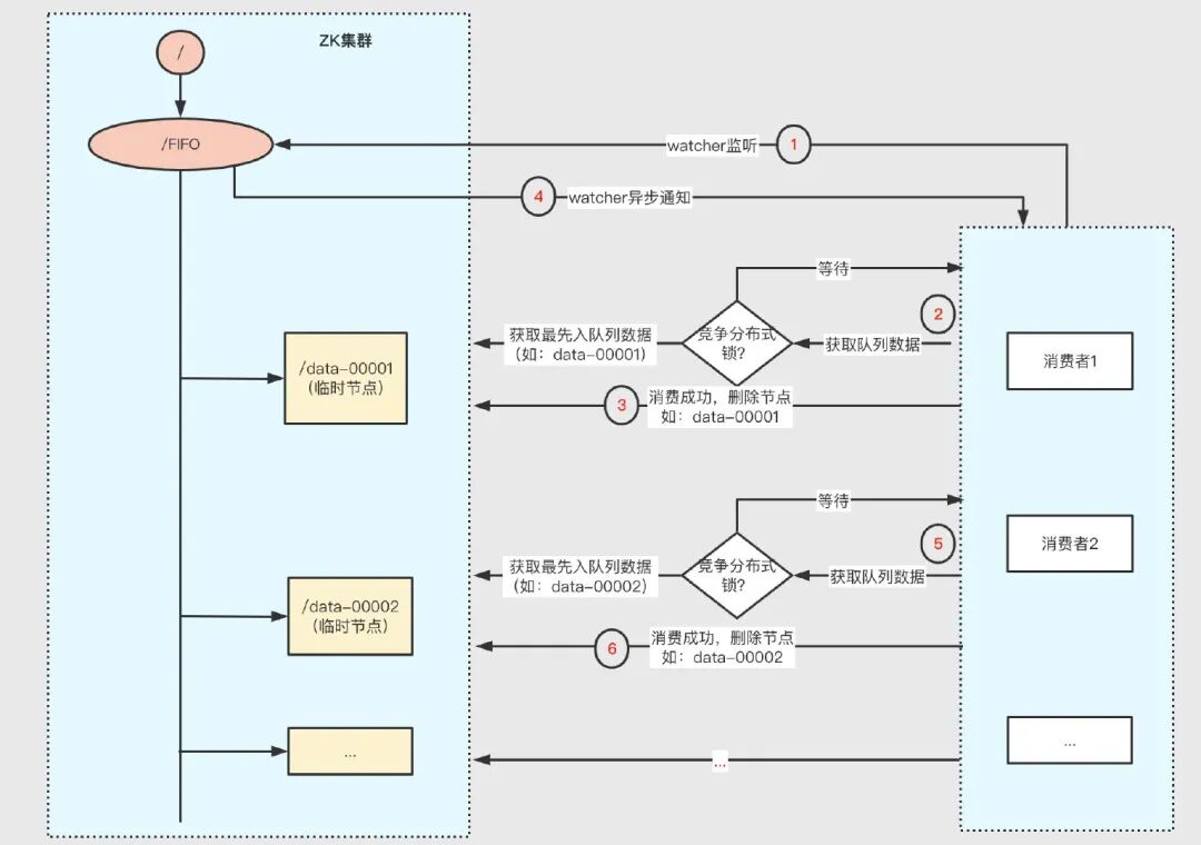 基于 ZK 的临时顺序节点和 Watcher 机制可实现简单的 FIFO 分布式队列。ZK 分布式队列和上节中的分布式锁本质是一样的,都是基于对上一个顺序节点进行监听实现的。具体原理如下: