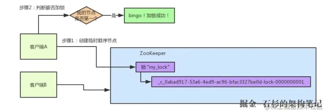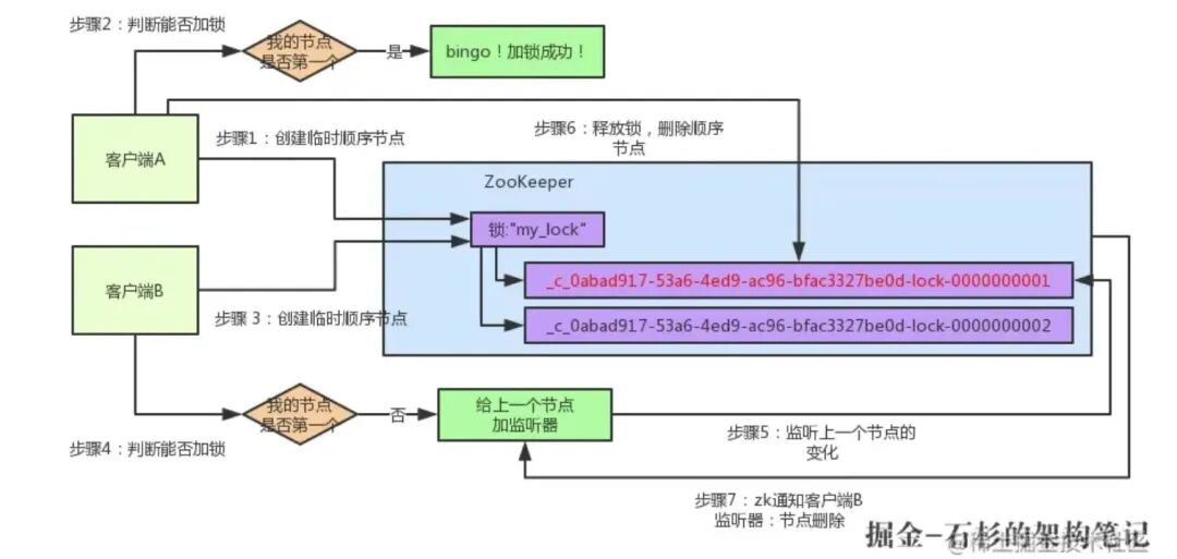 然后呢,客户端 B 判断自己居然是集合中的第一个顺序节点,bingo!可以加锁了!直接完成加锁,运行后续的业务代码即可,运行完了之后再次释放锁。