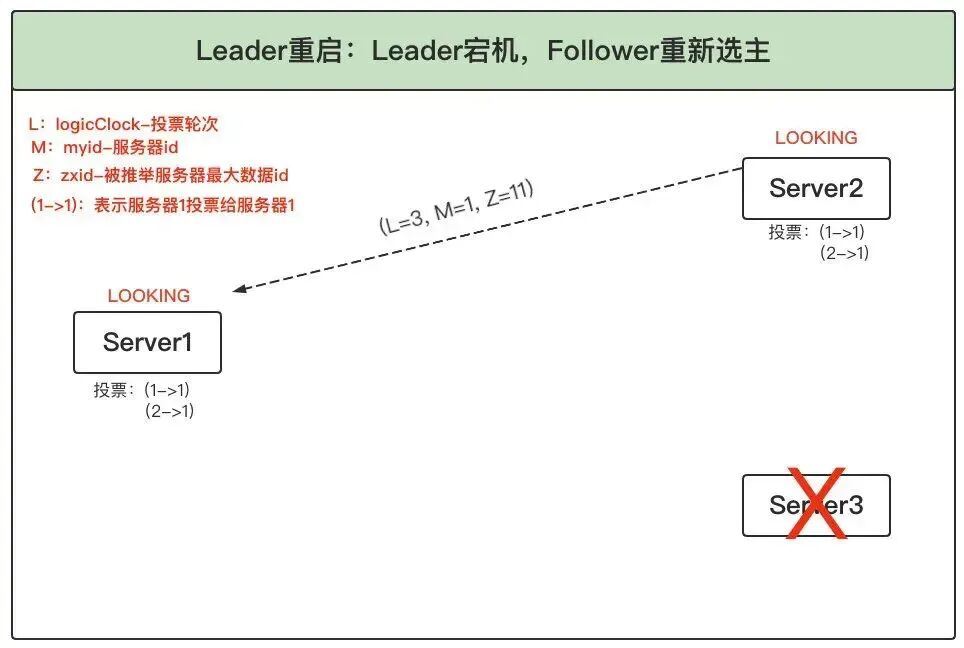 Follower 发起新投票:Leader(Server3)宕机后,Follower(Server1 和 2)发现 Leader 不工作了,因此进入 LOOKING 状态并发起新的一轮投票,并且都将票投给自己,同时将投票结果广播给对方。