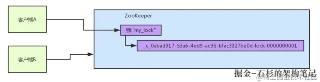 这一大坨长长的名字都是 Curator 框架自己生成出来的。然后,因为客户端 A 是第一个发起请求的,所以给他搞出来的顺序节点的序号是"1"。接着客户端 A 会查一下"my_lock"这个锁节点下的所有子节点,并且这些子节点是按照序号排序的,这个时候大概会拿到这么一个集合: