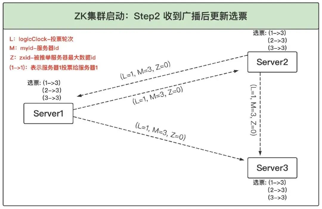 (1)Server1 收到 Server2 和 Server3 的广播选票后,由于 logicClock 和 zxid 都相等,此时就比较 myid;