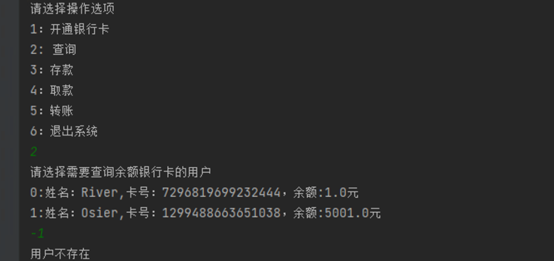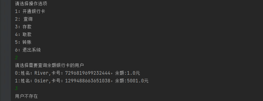 System.out.println(String.valueOf(i)+":"+"姓名:"+bankCustomers[i].getUsername()+","+"卡号:"+bankCustomers[i].getCardId()+",余额:"+bankCustomers[i].getBalance()+"元");