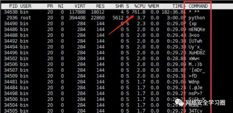 CPU 占用率超过 70% 且名字比较可疑的进程,大概率就是挖矿病毒了。