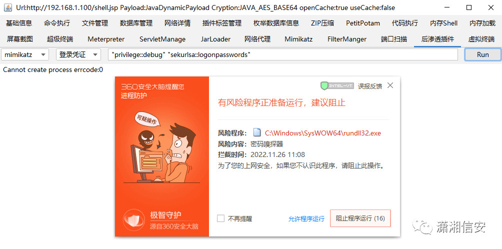 同时也尝试了下哥斯拉中的Mimikatz模块和后渗透插件中的Mimikatz功能,一样也都被拦了,目前能想到抓哈希和明文的方法都试了个遍,都不行...!!!![]()
