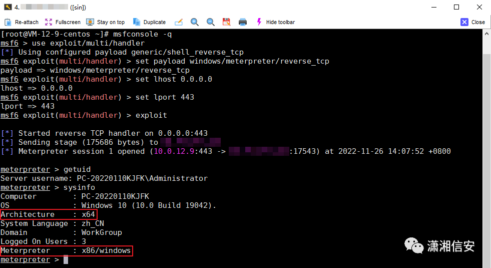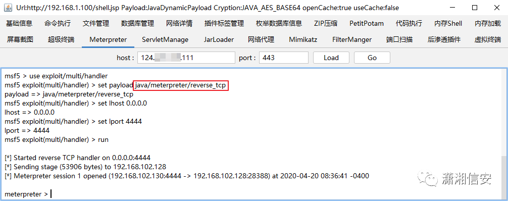 利用哥斯拉的内存加载重新上线得到一个Windows的meterpreter会话,这里的Payload与Meterpreter模块中的Payload不一样哦,tomcat是x86,所以监听时也得用x86的payload。