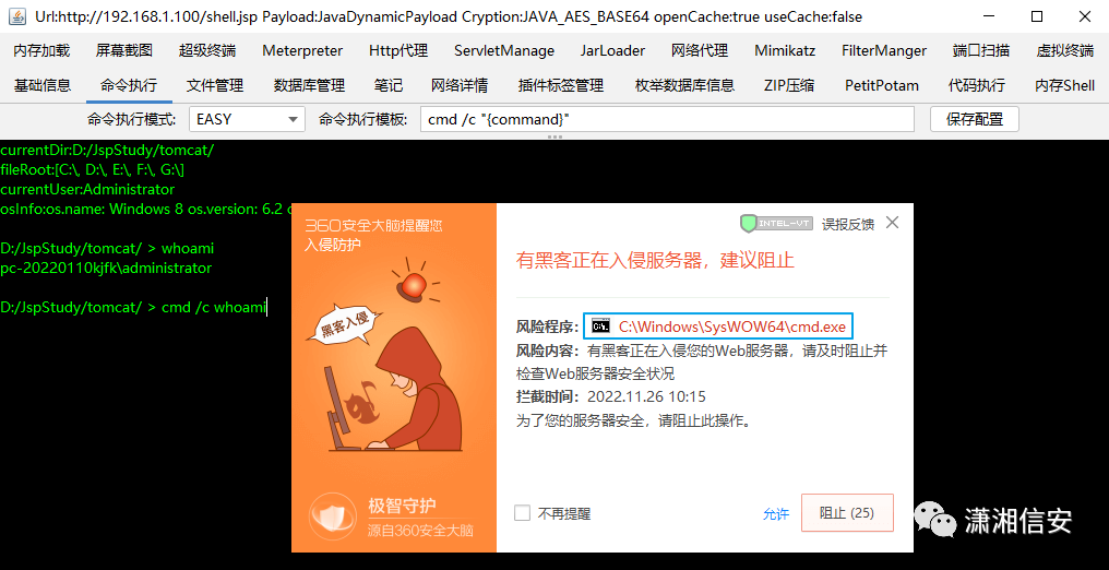 查看扩展发现只有stdapi,不能加载kiwi;migrate等命令也用不了;shell下发现可执行whoami,但加上cmd /c就会被360拦截,暂时无法利用白名单重新获取一个新会话来抓密码。哥斯拉执行也被360拦了,tomcat进程是x86,所以命令行下调用进程也是x86,之前有做过这方面测试,x86下想利用白名单绕过360还是挺难的。