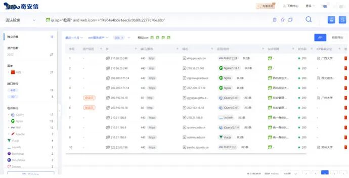 查询教育资产的语法:domain="edu.cn" 表示搜索以edu.cn为结尾的资产,ip.isp="教育",表示搜索教育网段的资产,后者的搜索规模是比前者大很多