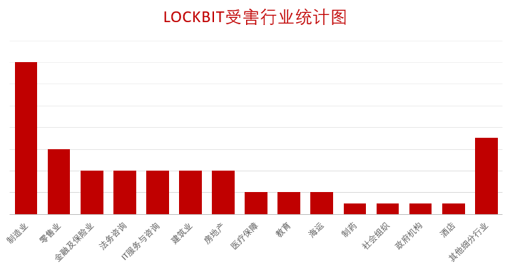 在十月我们观察到的攻击活动中,实体制造业受到LockBit3.0的攻击最多,其次是教育与医疗行业。LockBit的成员在接受采访时曾表示,他们是有道德准则的组织,不会对医疗保健、教育等行业进行攻击。但是行动证明,LockBit招募的下级团伙中,并没有很好的遵守“武德”,目前仍能检测到针对其“豁免”行业的攻击活动。相关所谓的“豁免”行业的企业不应该相信此类声明而放松警惕,在绝对的利益面前,黑客的“道德准则”如纸一般单薄。