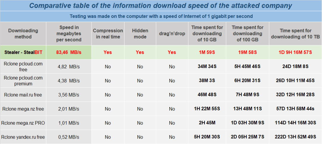 现代的勒索软件中,除了加密数据外还会采取多重勒索模式,即偷取受害主机上的用户数据,达到双重勒索的目的。除了使用商业软件“Rclone”、“MEGASync”外,LockBit还开发了自己独有的数据窃取工具“StealBit”提供给附属团伙,以作为招募附属计划的一部分。StealBit 使用 Microsoft I/O完成端口模型,以最大限度地提高数据泄露活动的整体效率。例如,StealBit 将多个文件内容的泄露并行化,以缩短整体泄露时间跨度。这对勒索软件运营商来说很重要,因为快速的数据泄露会减少在此过程中被发现的机会。LockBit将StealBit与传统数据传输软件进行比较,以此来证明StealBit在数据窃取方面更胜一筹:![]()