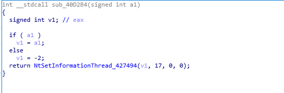 LockBit3.0还会通过使用未记录的值 THREAD_INFORMATION_CLASS::ThreadHideFromDebugger (0x11) 调用 NtSetInformationThread API 来执行线程隐藏来达到反调试的效果:![]()