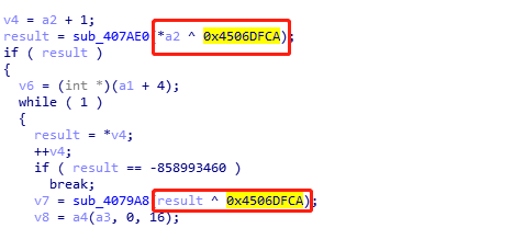 LockBit3.0外层使用包装器,其导入表几乎为空,大多数 API 函数的调用是通过调用解密函数来动态解析的,该函数使用 XOR 算法对 API 函数进行解密,本次样本中xor key为0x4506DFCA:![]()
