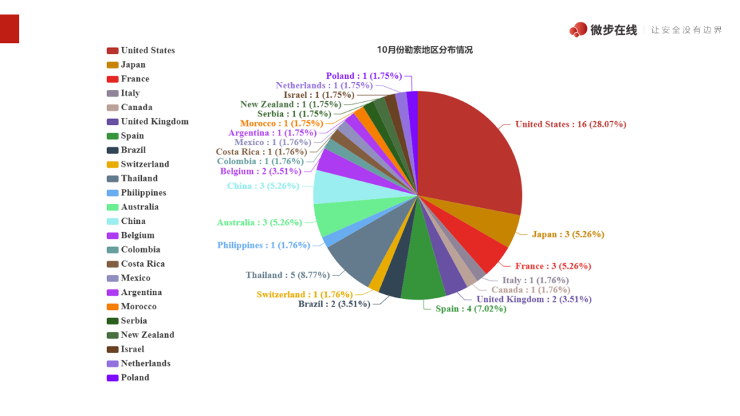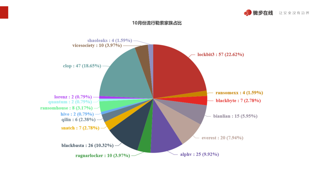 10月份监测发现已知勒索活动252起,其中LockBit3.0勒索软件57起,占比 22.62% 居首位,主要影响地区覆盖美洲、西欧和亚太地区;