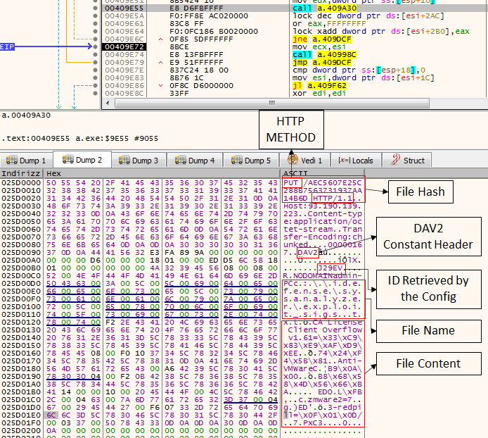 StealBit在PE文件中以加密的形式存储着传输文件的攻击者服务器、攻击活动ID等config信息,采取了xor key的方式进行解密。其解密函数如下:当StealBit与任意一个C2建立连接后,会读取命令行指定的文件进行数据传输,为了使传输尽可能的块,其使用HTTP PUT方法进行该操作,其HTTP请求的字段如下:![]()