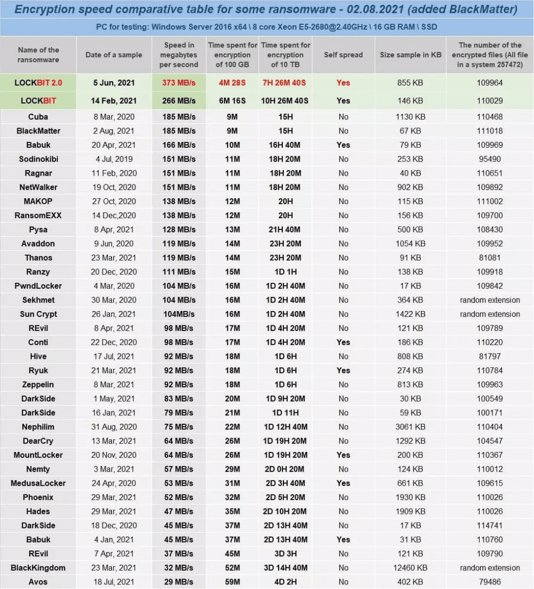 LockBit号称是世界上加密速度最快的勒索软件,采用自己设计的AES+ECC算法,加密时使用多线程,每次仅加密每个文件的前4KB。根据其洋葱网络上的博客数据显示,Lockbit以每秒373M的速度位列所有勒索病毒的第一名,加密100GB的文件仅需要4分半钟。