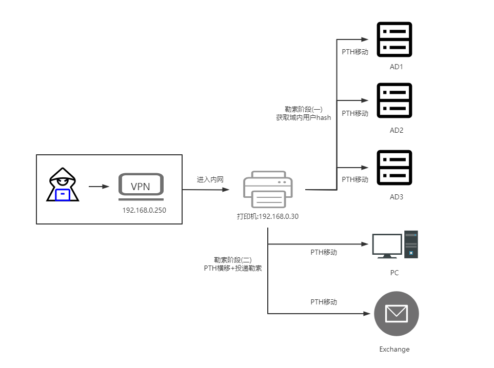 综上分析,LockBit3.0勒索利用VPN设备任意账户读取漏洞进入内网,对内网环境进行了大量扫描探测和信息收集,随即拿到打印机服务器本地账户权限作为据点,并逐渐摸清域环境脉络,提升到域管理员权限,逐步定位到域控、Exchange邮件服务器、共享文件服务器等多个核心服务器,最终利用Psexec配合域管哈希对内网多个员工终端进行了批量横移 + 勒索投递操作。![]()