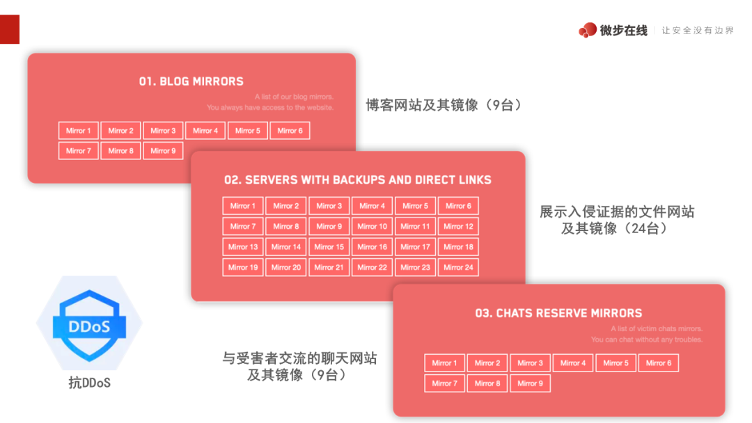 变身归来的LockBit拥有了9台博客网站及其镜像、24台展示入侵证据的文件网站及其镜像以及9台与受害者交流的聊天网站及其镜像:![]()