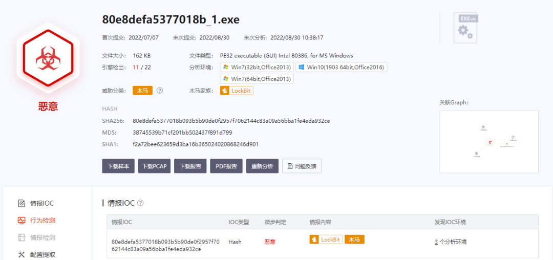 自2022.3月微软发现LockBit2.0存在代码缺陷可以实现文件解密后,LockBit团伙于2022年6月底发布了3.0版本的勒索木马,此处分析示例为LockBit 3.0版本。5.2.1基本信息