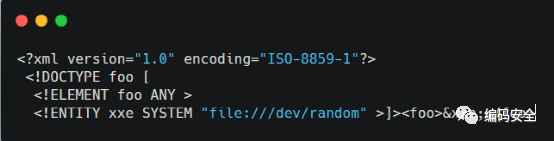 XXE示例:打开本地文件/dev/random,返回无限字节流,可能导致拒绝服务。