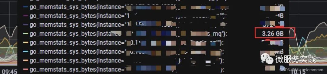 我们线上有一个 mq 的服务监控告警,内存占用比较高,这时候我打开 grafana 看到服务内存累计占用的确异常,如下图: