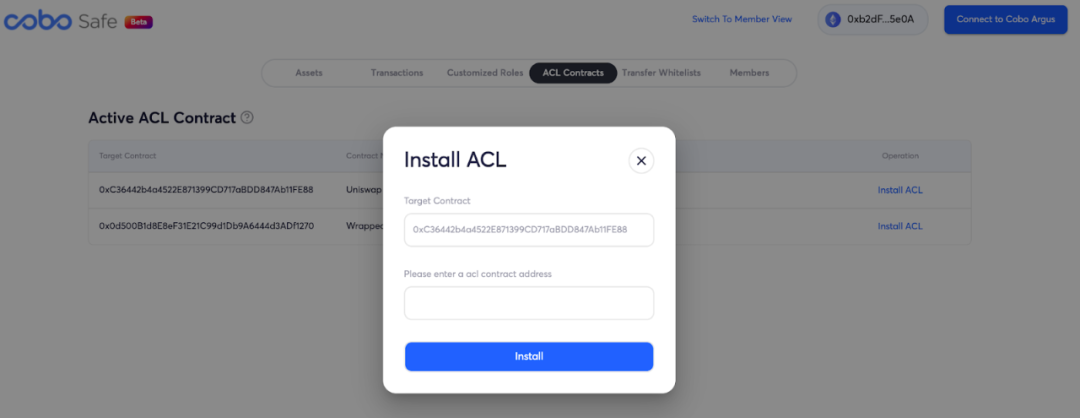 ACL 合约,可以灵活地设置各类分权及风控规则,如:token 资产)swap 滑点损失不高于某个百分比)值得说明的是 Cobo Safe 作为 Cobo 推出的去中心化托管方案 Argus(https://argus.cobo.com/的重要组成部分,其链上合约源码均是开源的。因为用户方或其他第三方可对 Cobo Safe 及 ACL 合约源码进行审计,以保证托管功能不存在中心化做恶的风险。