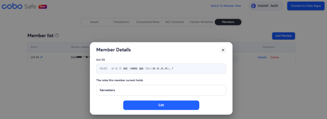 在 Cobo Safe 添加成员的同时,可指定前述限制的用户角色。被赋予某一角色的地址,就可使多签名钱包执行特定合约调用交易。如下即给 0x20XX 地址赋予 harvesters 角色,允许 0x20XX 地址以多签钱包的身份,代为发起 collect 函数调用的合约交易。